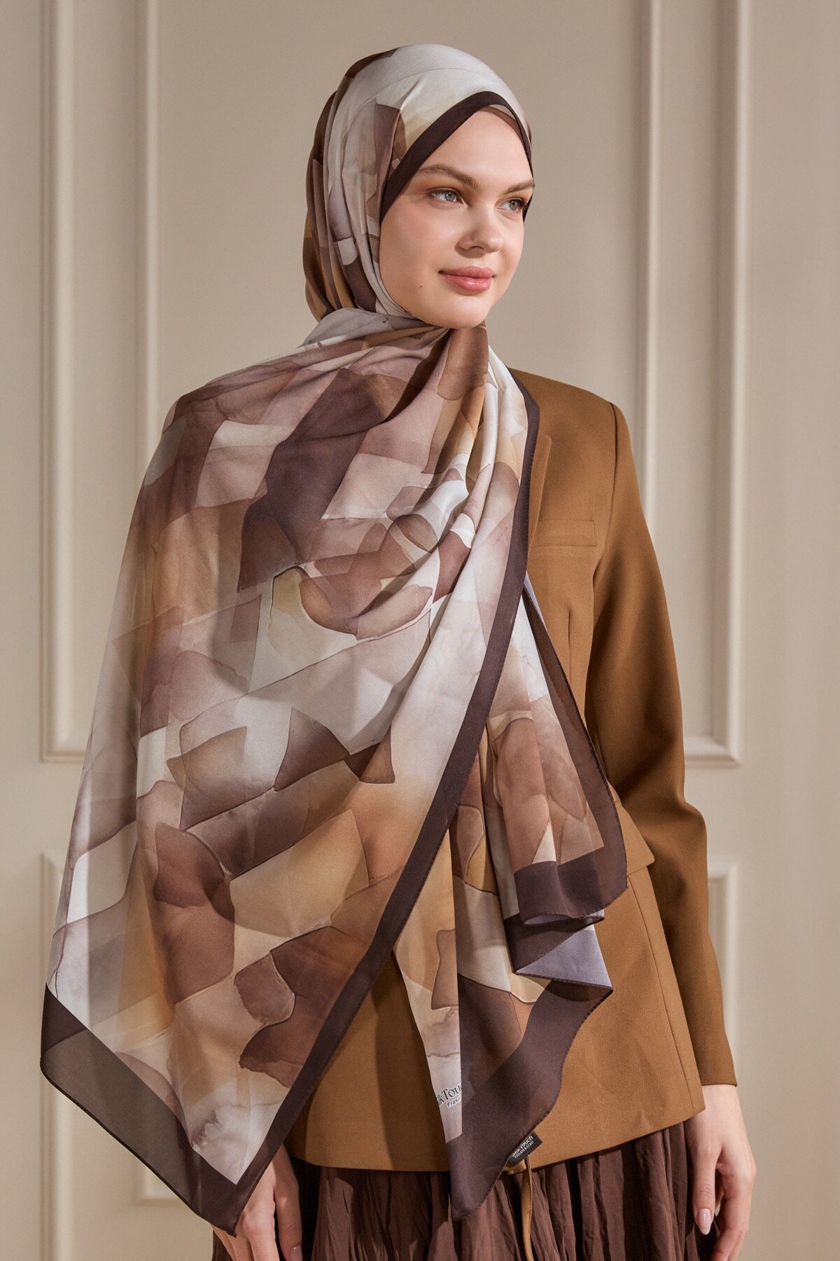 Acı Kahve'nin derinliği, Kristal Işıltı deseninin göz alıcı parıltısıyla Fransız İpeği'nin üzerinde asil bir kontrast oluşturur. Bu şal, sade ve şık görünümü lüks bir dokunuşla tamamlar.