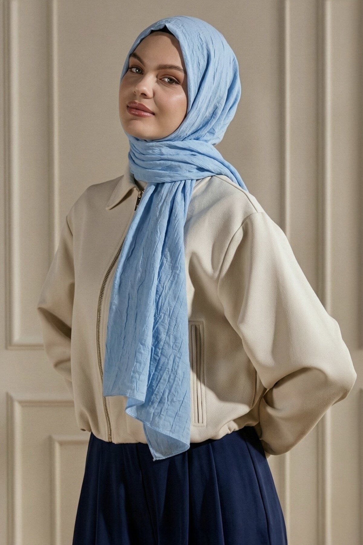 Bebe Mavisi renginin sıcak ve otantik tonu, Kraş şalın rahat dokusuyla sonbahar zarafetini stilinize taşır. Doğal tonların huzurunu üzerinizde hissedin.