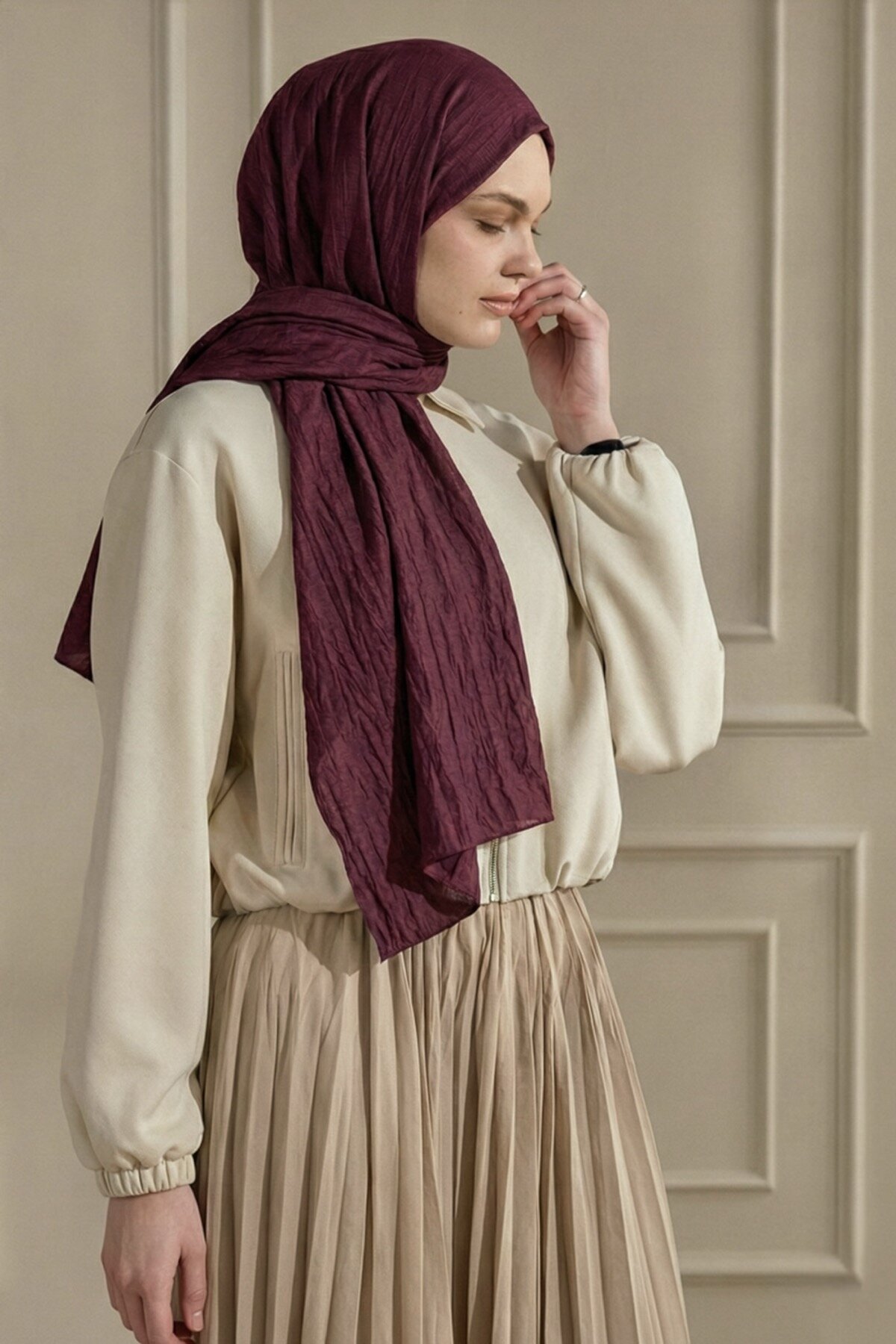 Bordo'nun asil ve derin tonu, Kraş şalın yumuşak dokusuyla birleşerek güçlü bir duruş sergiler. Kış aylarının şıklığını zarafetle tamamlayın.