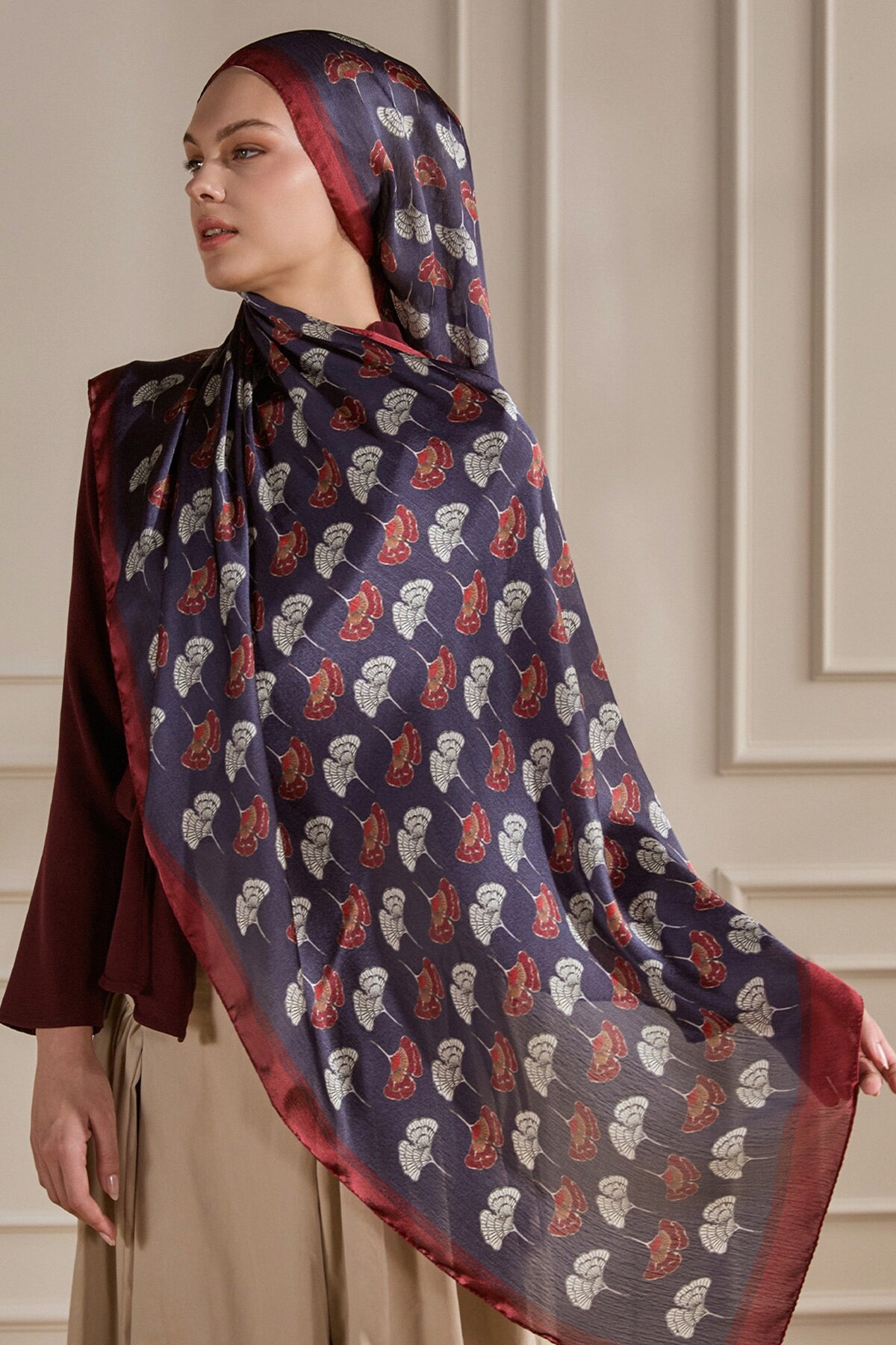 Bordo Mavi Yonca deseninin zarif ve şans getiren motifleri, İdol Vual şalın hafif dokusuyla her an yanınızda. İpeksi tuşesi ve narin deseniyle günlük şıklığınıza pozitif bir dokunuş katın.
