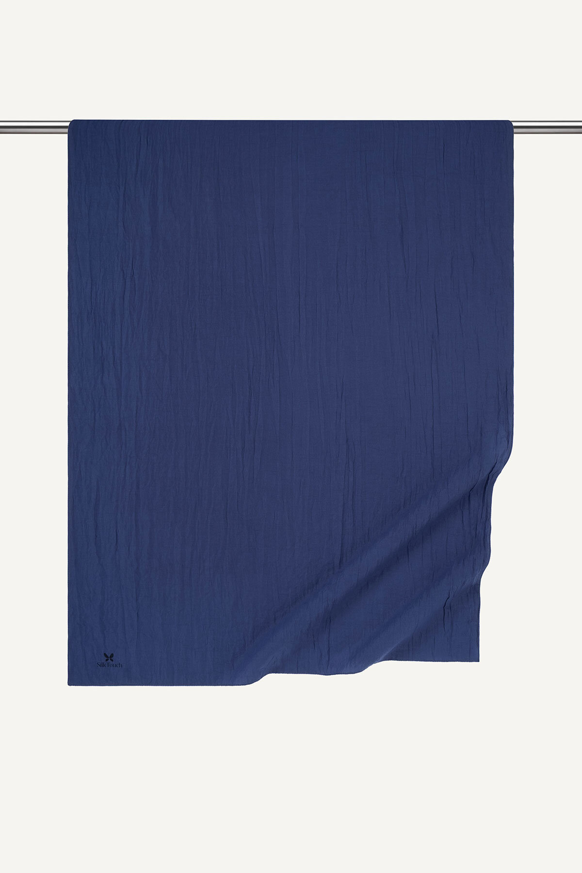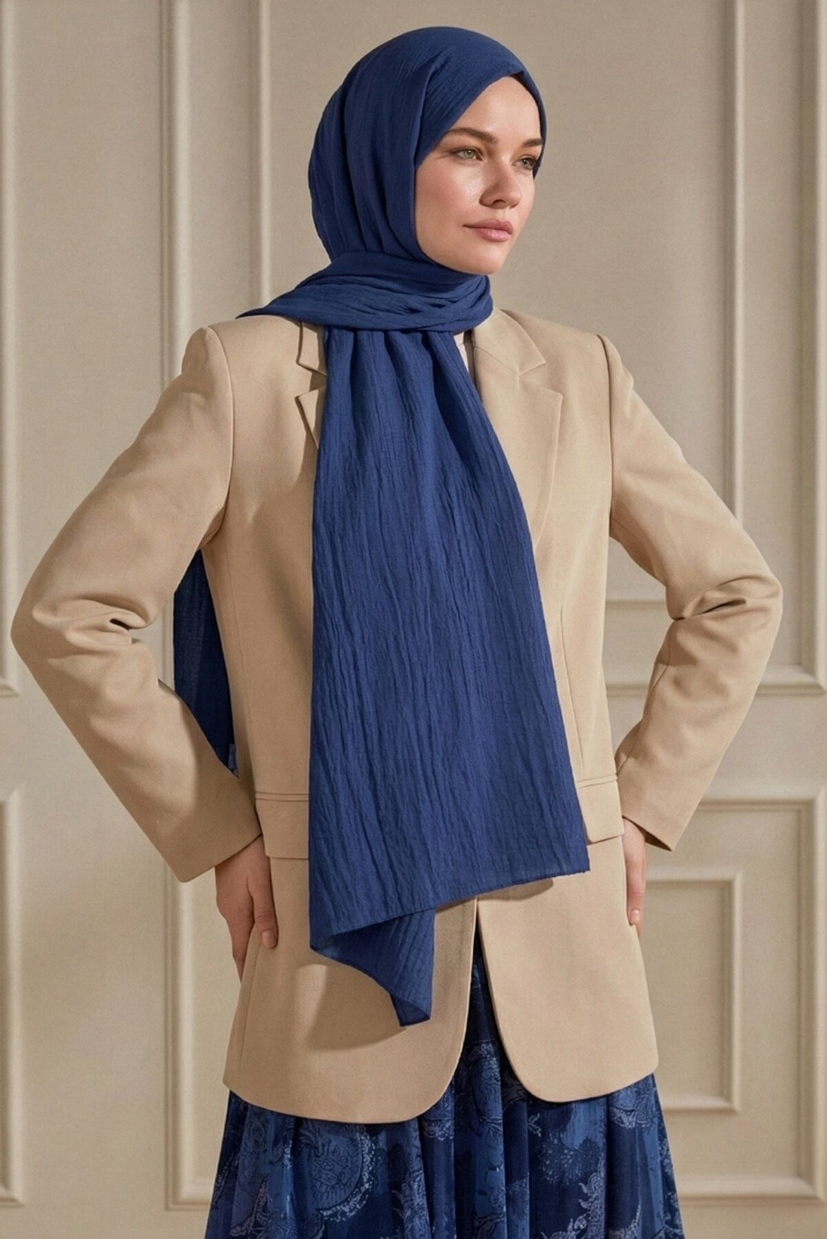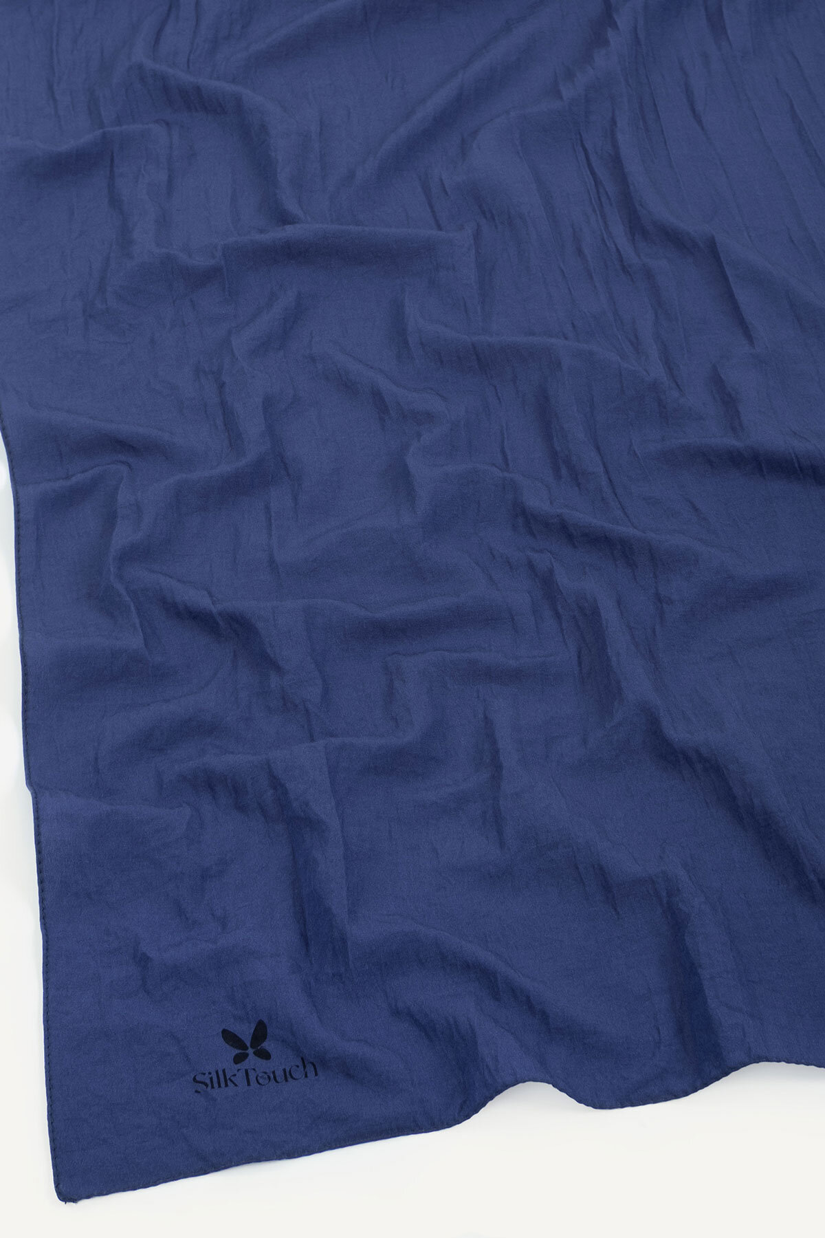 Gece Mavisinin gizemli ve derin tonu, Mercan şalın ipeksi yüzeyinde lüks bir ışıltı yaratır. Özel davetlerde bile rahatlıkla kullanabileceğiniz asil bir parçadır.