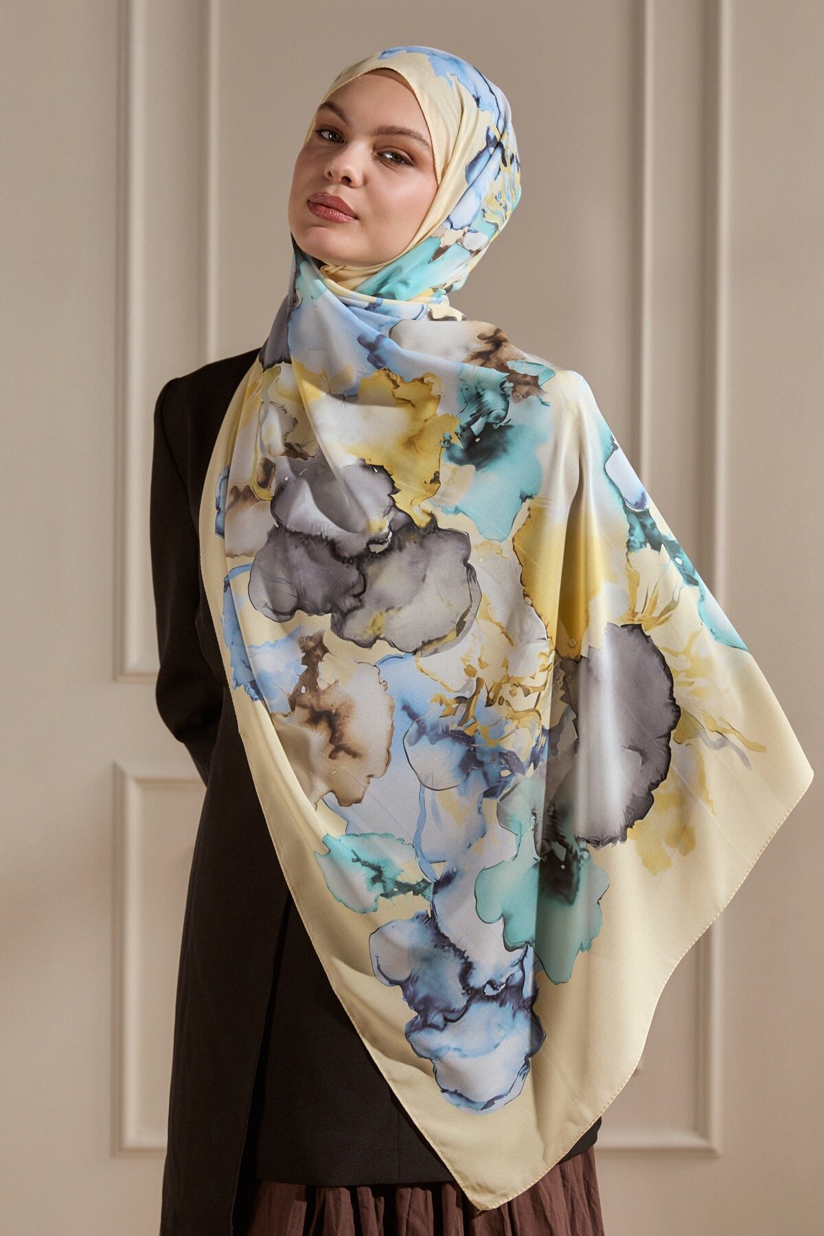 Gold Mermer Bulutu deseninin sanatsal akışı, Fransız İpeği'nin lüks dokusuyla birleşerek sofistike bir görünüm sunar. İpeğin ışıltısı ve desenin modernliği, stilinize benzersiz bir hava katar.