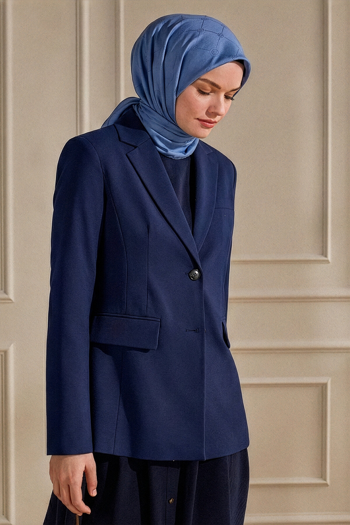 İndigo'nun sofistike tonu, Monogram deseninin modern geometrisiyle Mercan eşarbın üzerinde minimalist ve güçlü bir duruş sergiler. Bu Mercan eşarp, şehirli şıklığın simgesidir.