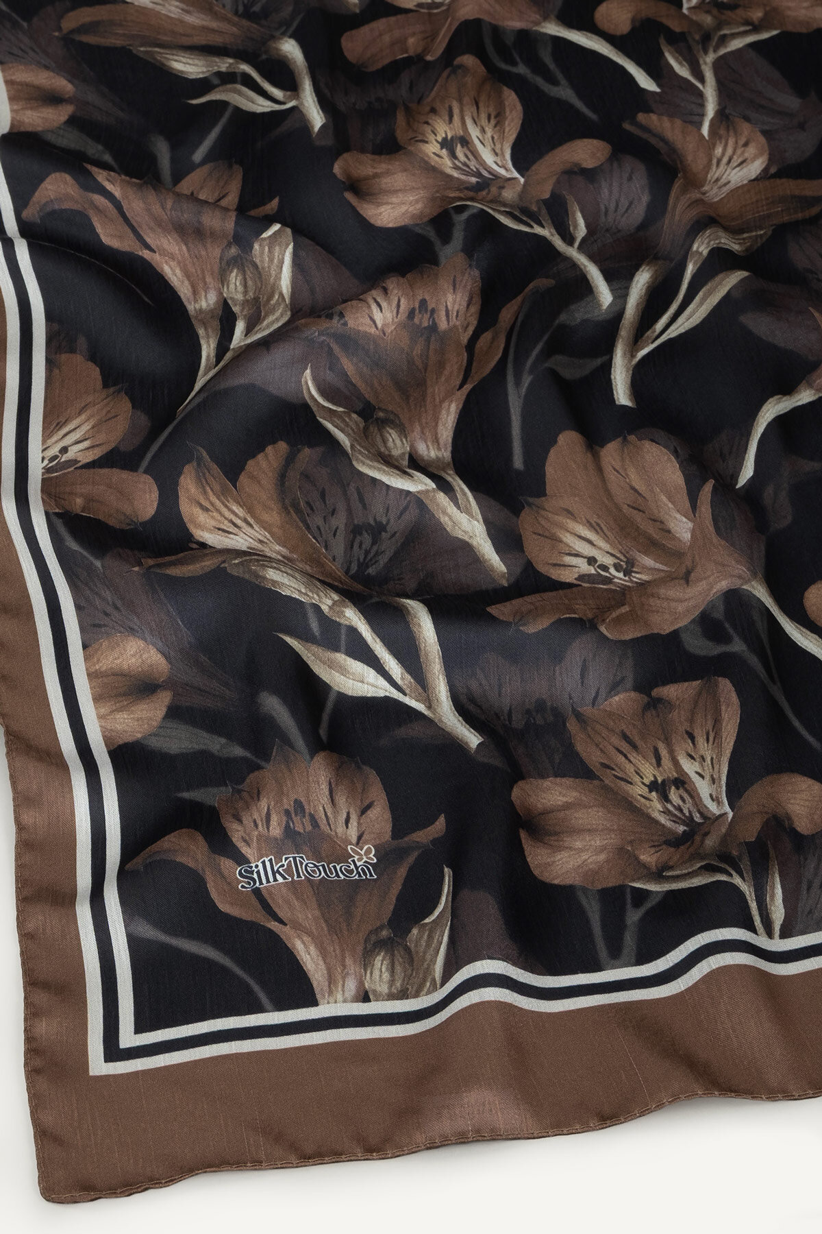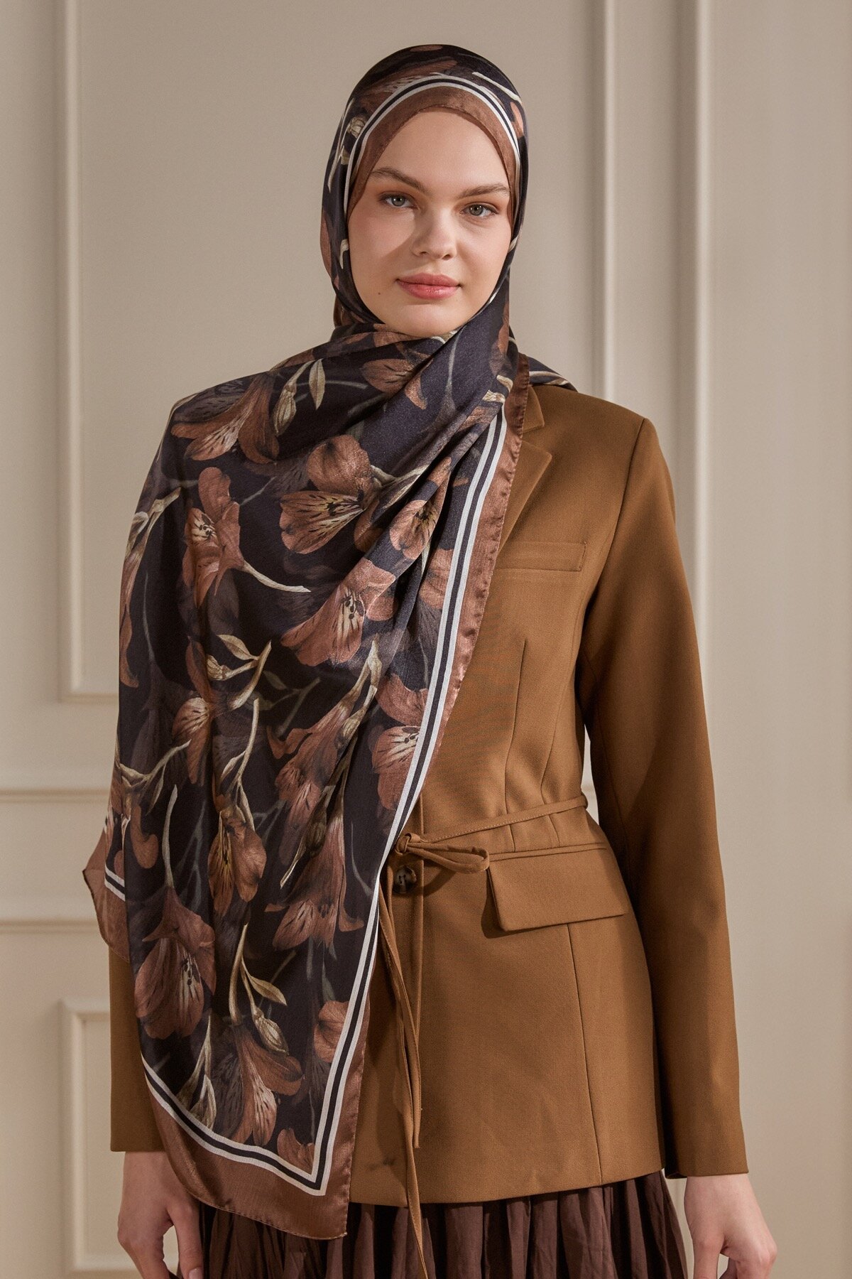 Kahve'nin doğal tonu, Lale deseninin klasik çizgileriyle İdol Vual şalın üzerinde asil bir görünüm sunar. İnce ve hafif yapısıyla dört mevsim konforlu bir şıklık sağlar.