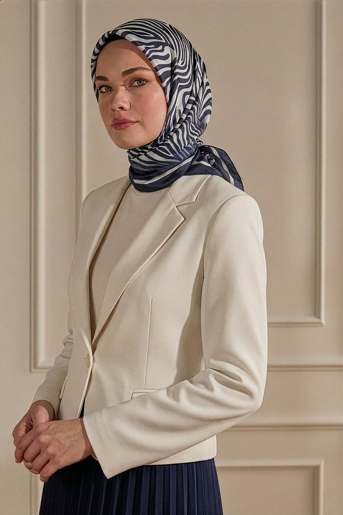 Lacivertin klasik asaleti, Zebra deseninin dinamik çizgileriyle Kristal Eşarbın üzerinde lüks bir görünüm sergiler. Bu eşarp, modern ve zarif bir stilin çarpıcı bir detayıdır.