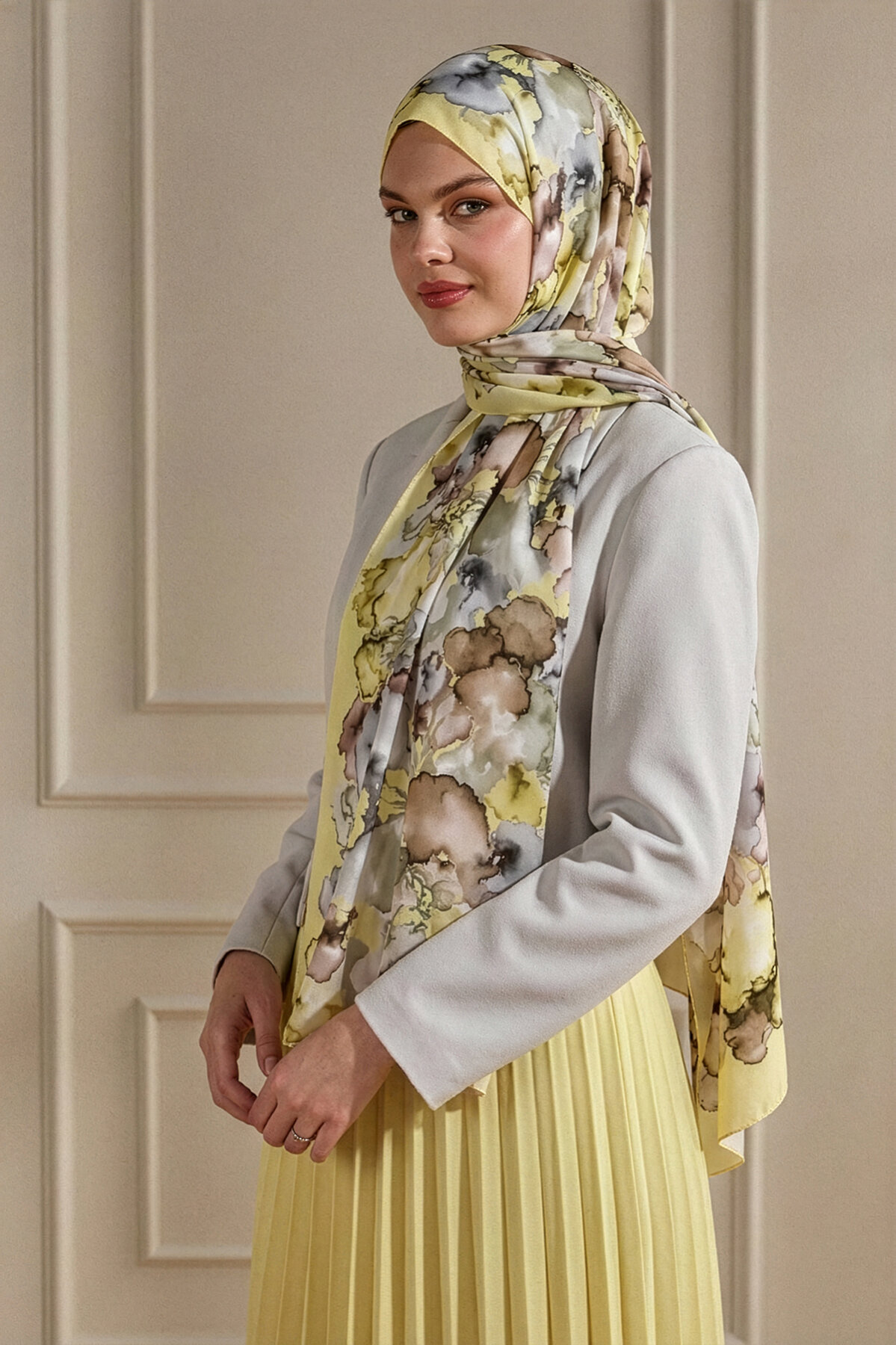 Sarının canlı enerjisi, Mermer Bulutu deseninin akışkanlığıyla Fransız İpeği'nin üzerinde dinamik bir etki bırakır. Lüks kumaşın parlaklığı ve canlı rengiyle tüm dikkatleri üzerinize çekin.