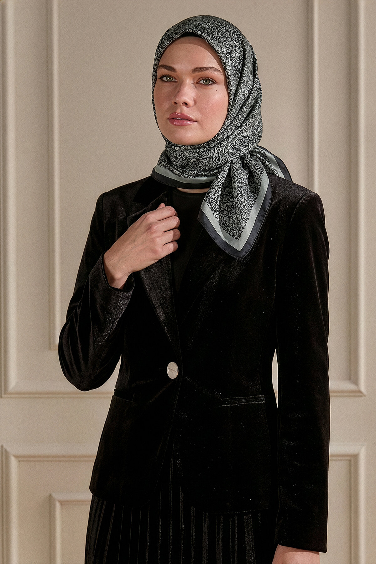 Siyah ve Gri'nin sofistike uyumu, Etnik desenin otantik motifleriyle Kristal Eşarbın üzerinde modern bir zarafet yaratır. Kristal eşarbın ipeksi parlaklığıyla her anınızda lüksü hissedin.