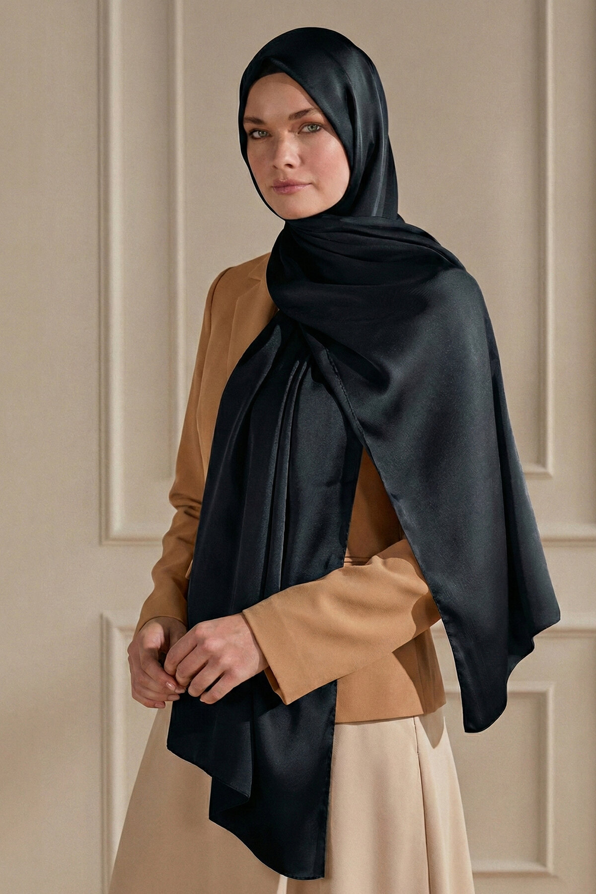 İnci Şal'ın tok ve zarif dokusu, Siyahın zamansız asaletiyle birleşerek sofistike bir görünüm sunar. Yumuşak tuşesi ve zarif dökümüyle dört mevsim şıklığınızın vazgeçilmezi olacaktır.