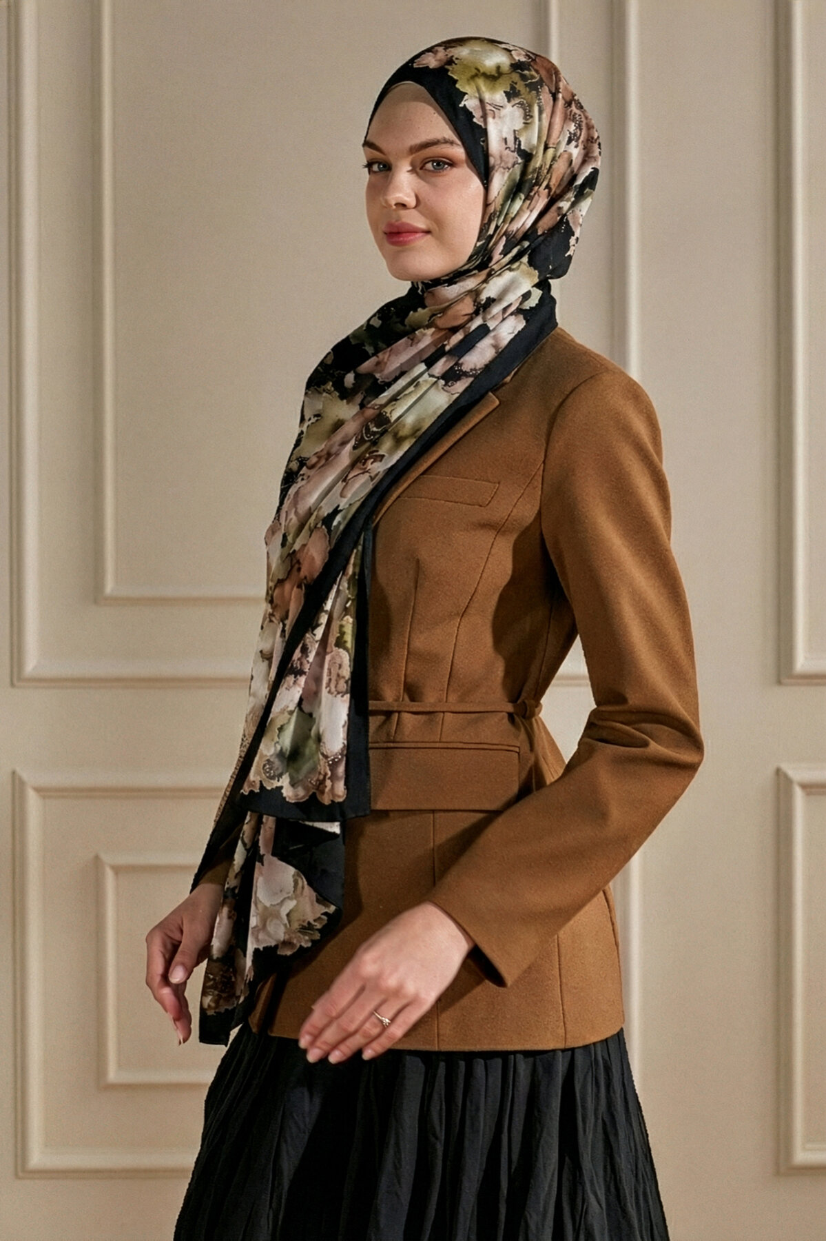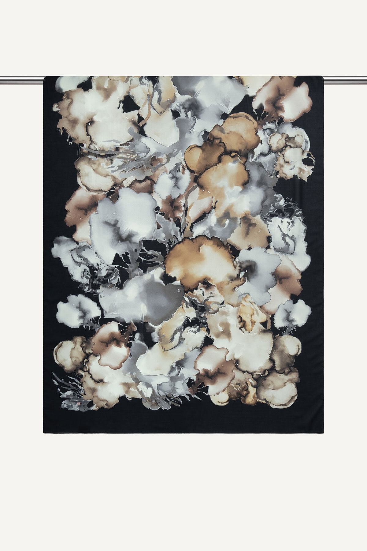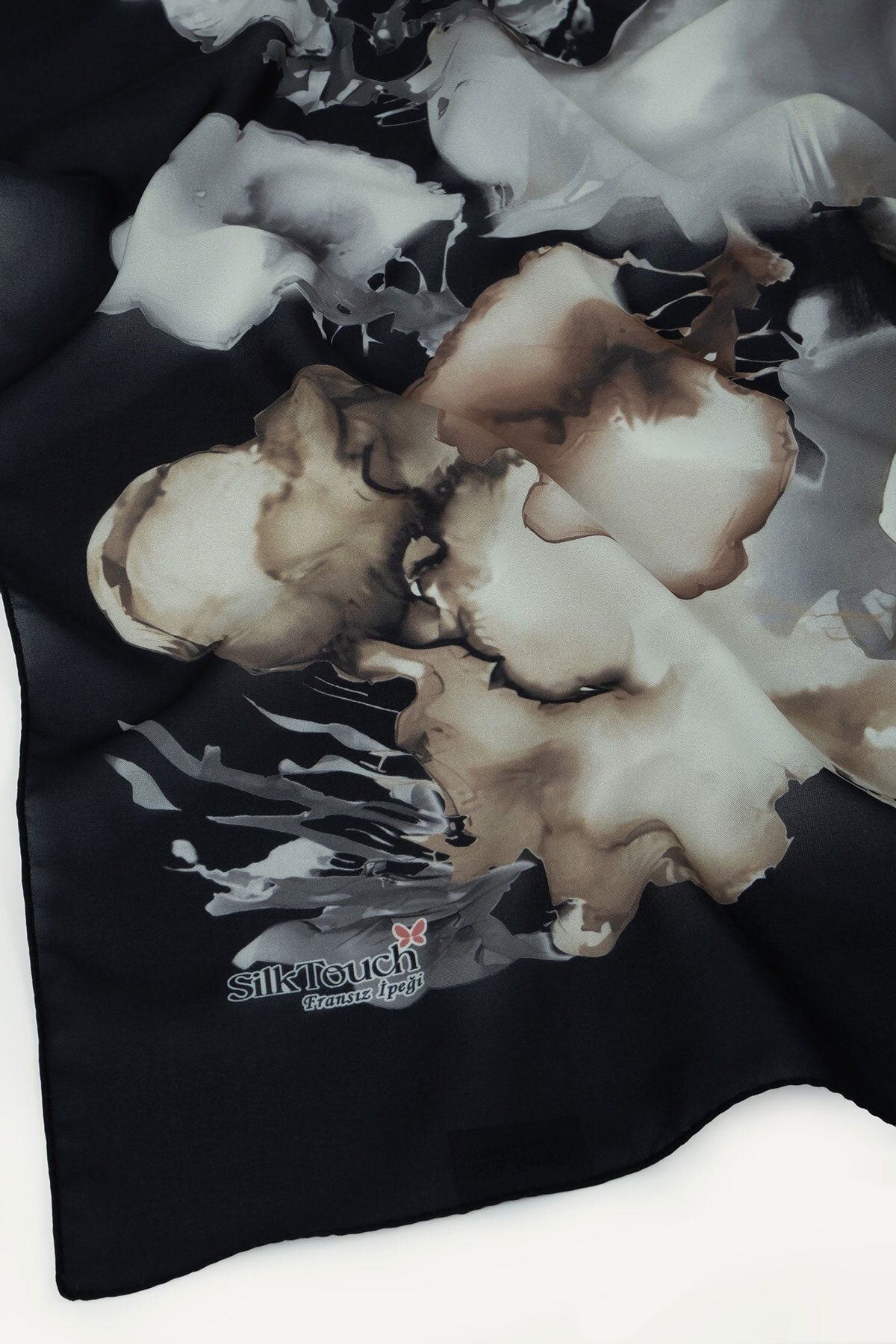 Siyah üzerine Mermer Bulutu deseninin gizemli dansı, Fransız İpeği'nin ışıltısıyla buluşarak sofistike bir şıklık yaratır. Bu şal, klasik siyahın gücünü sanatsal bir dokunuşla birleştirir.