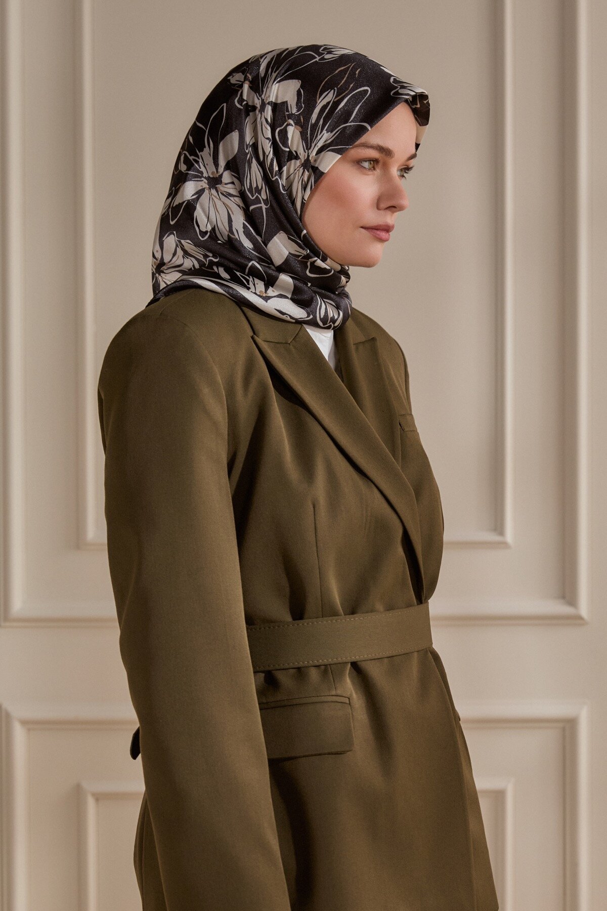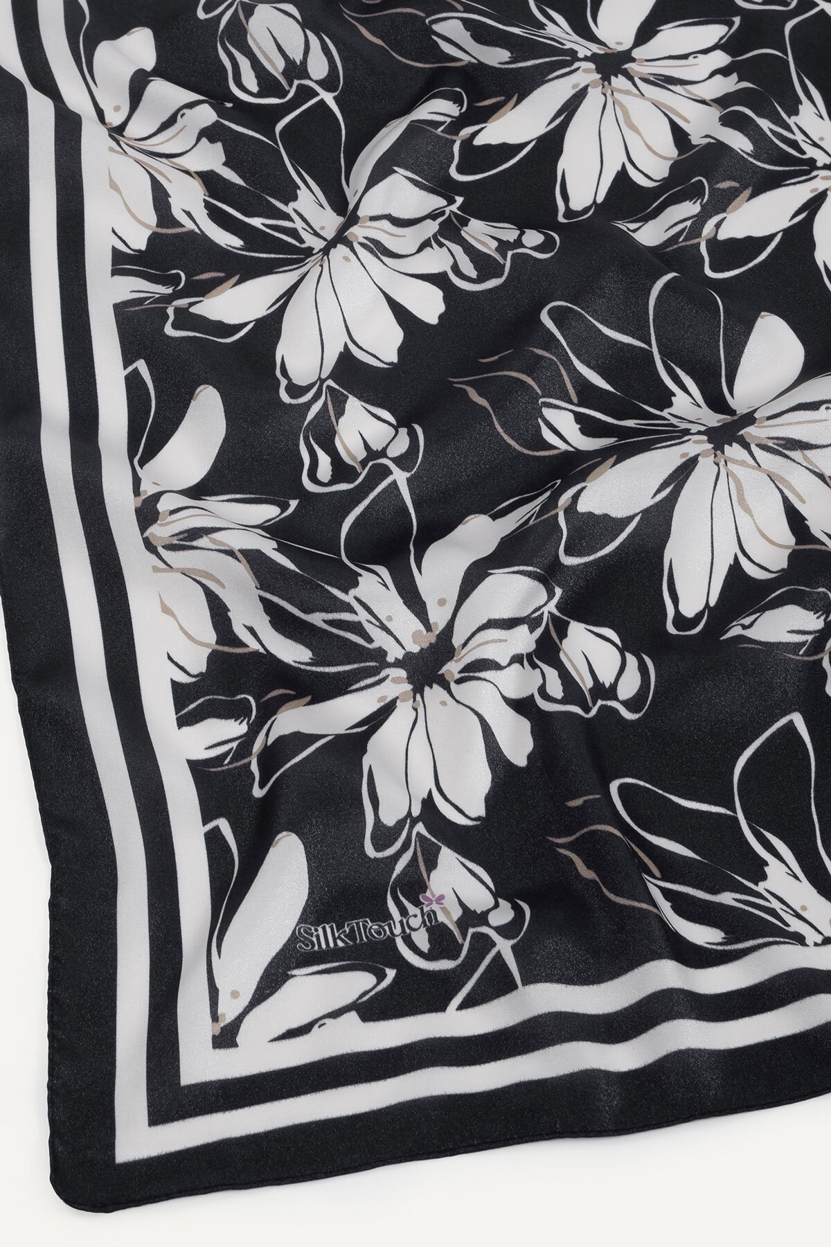 Siyahın asaleti üzerine işlenmiş Şakayık deseninin narinliği, Kristal Eşarbın üzerinde romantik bir kontrast oluşturur. Kristal eşarbın ipeksi parlaklığıyla feminen ve güçlü şıklığı birleştirin.