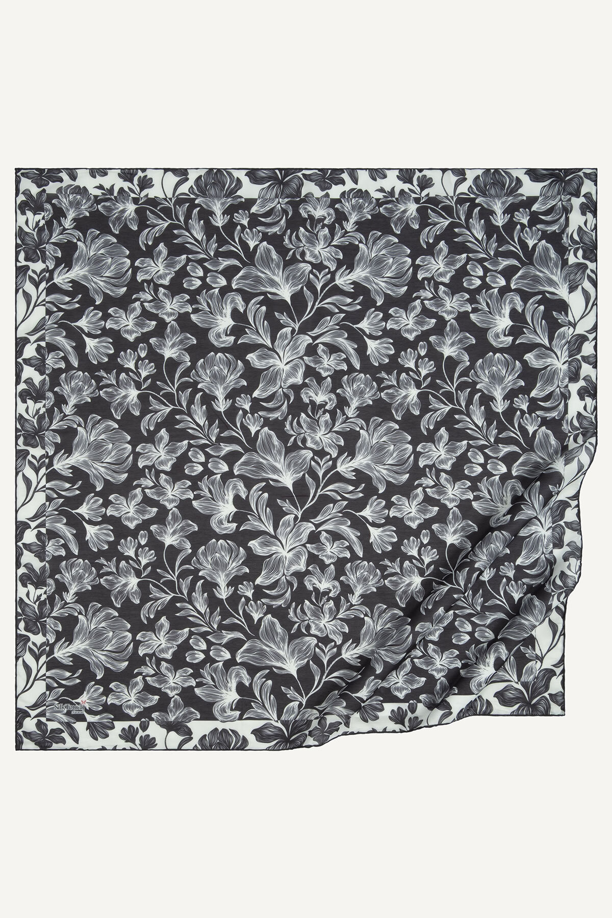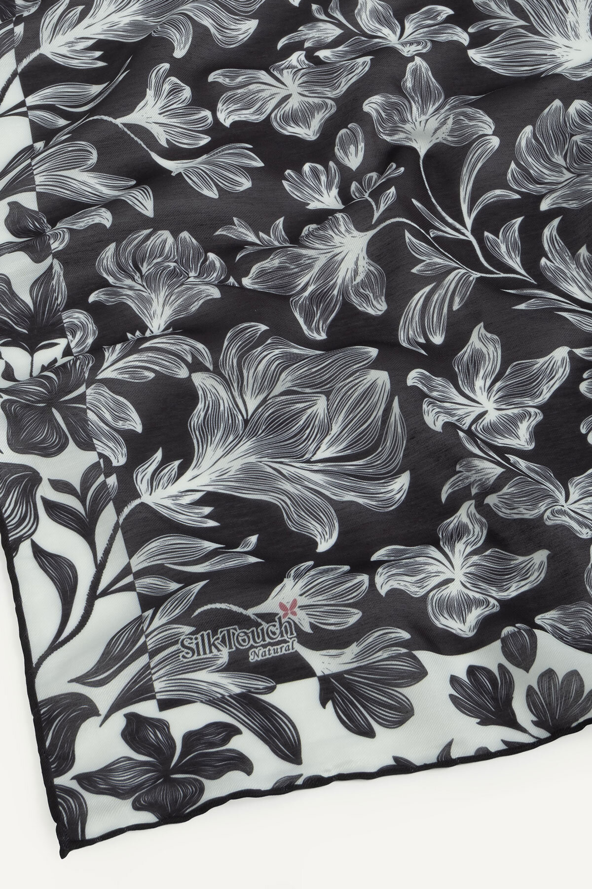 Siyahın asaleti üzerine işlenmiş Zambak deseni, Natural Eşarbın tok ve doğal dokusuyla lüks bir görünüm sergiler. Bu eşarp, klasik siyahın gücünü feminen bir desenle birleştirir.
