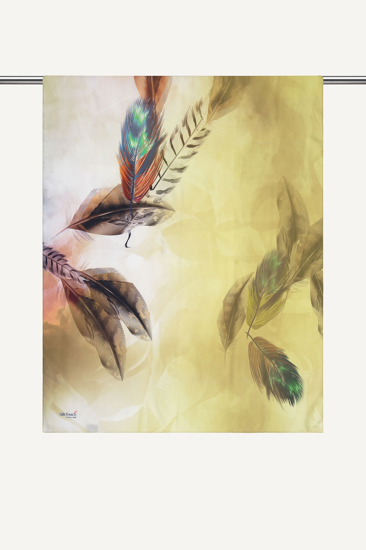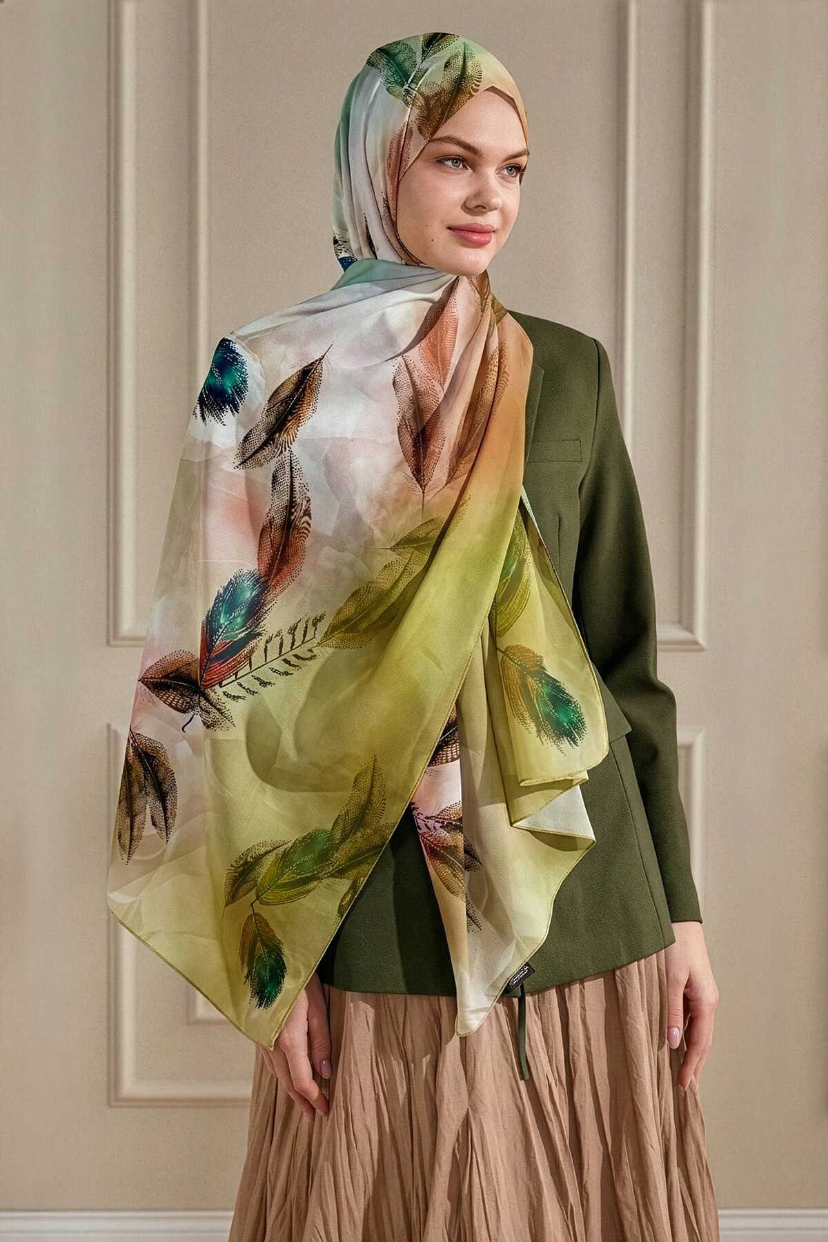 Yağ Yeşili'nin doğal ve derin tonu, Kehribar Tüyü deseninin narin motifleriyle Fransız İpeği'nin üzerinde sofistike bir uyum yakalar. Bu şal, toprak tonlarının asaletini ipeğin lüksüyle birleştirir.