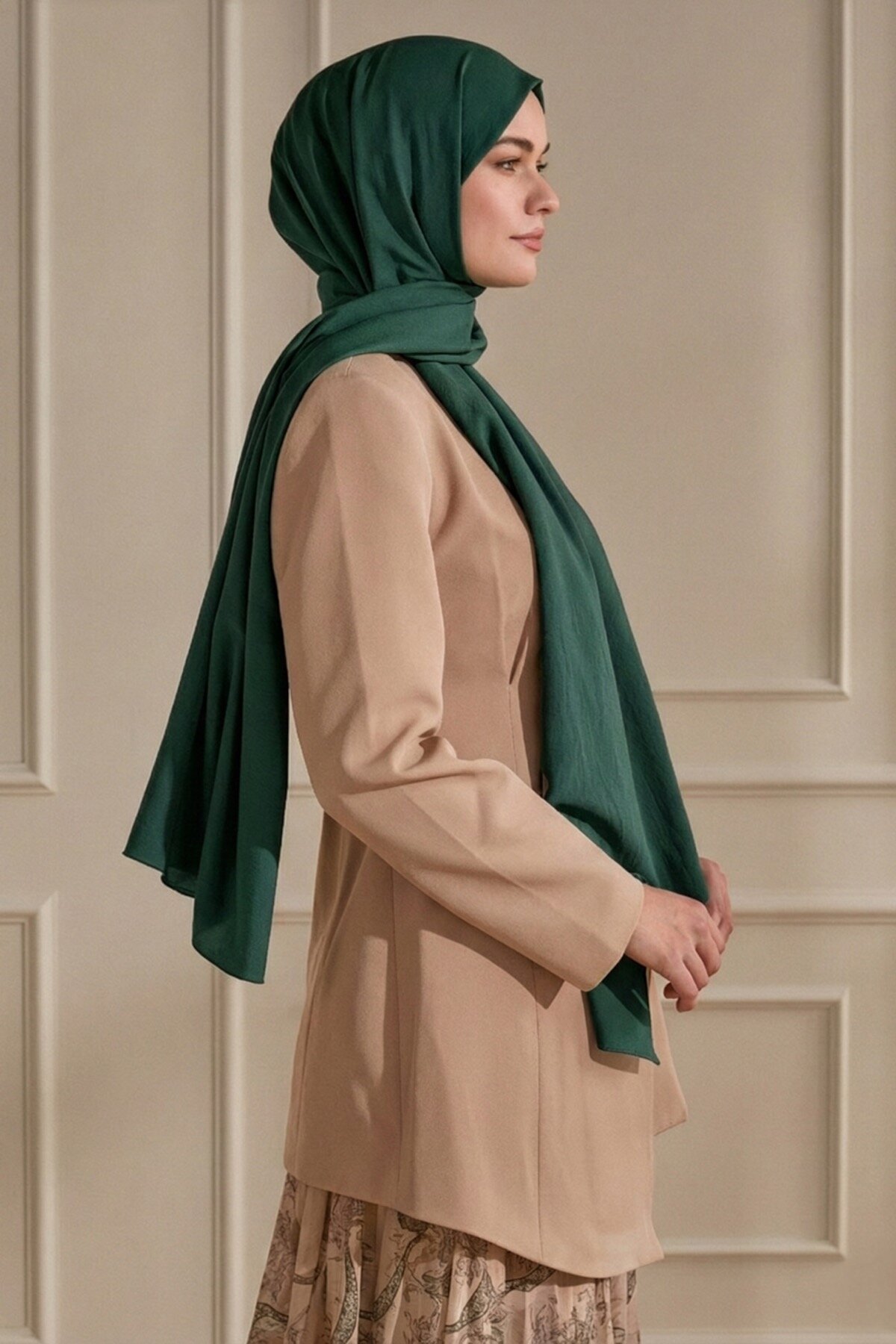 Zümrütün görkemli rengi, Mercan şalın ipeksi dokunuşuyla birleşerek lüks bir etki yaratır. Kombininize anında derinlik ve asalet katan özel bir parçadır.